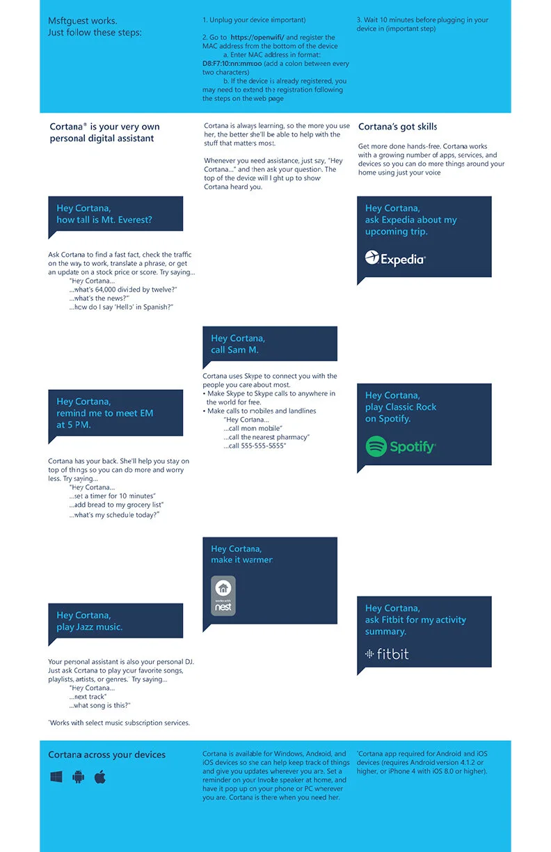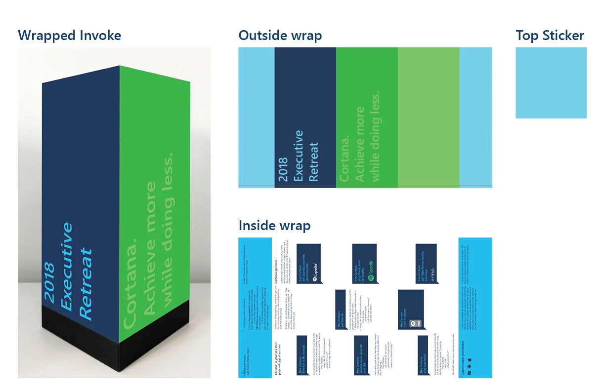 This wrap was designed to be secured around the Invoke Harmon Kardon speaker box as a gift to Microsoft Executives at the annual retreat. The inside of the wrap includes an informative poster on how to set up the speaker and what 3rd party skills it can execute.